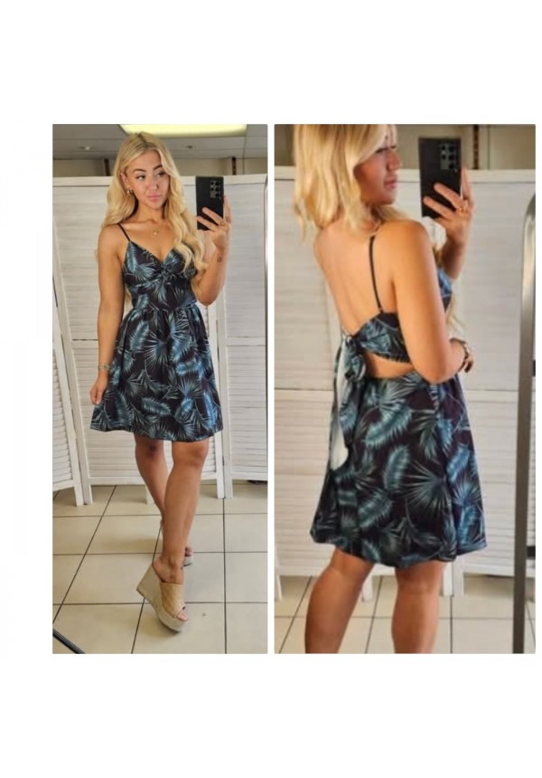 A sultry twist on summer sweetness, this strappy mini dress is your go-to for balmy nights and breezy brunches. Featuring a hypnotic palm print on a midnight backdrop, a cinched waist for that hourglass pop, and a flirty A-line skirt that moves with you — she’s light, airy, and a little bit daring. Just add wedges and watch the temperature rise.