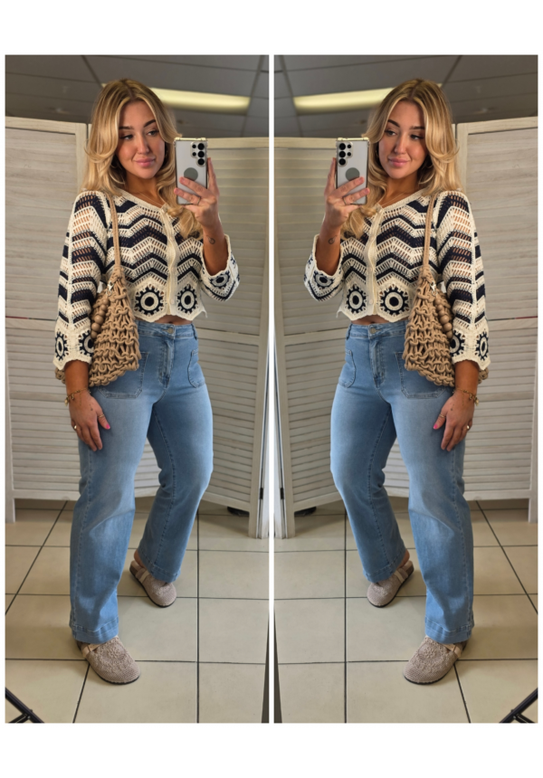 This statement crochet cardigan blends bold monochrome tones with an intricate zig-zag knit for that effortlessly elevated look. Designed with a relaxed fit and soft, breathable feel, it’s perfect for layering through the seasons while still letting your outfit shine.