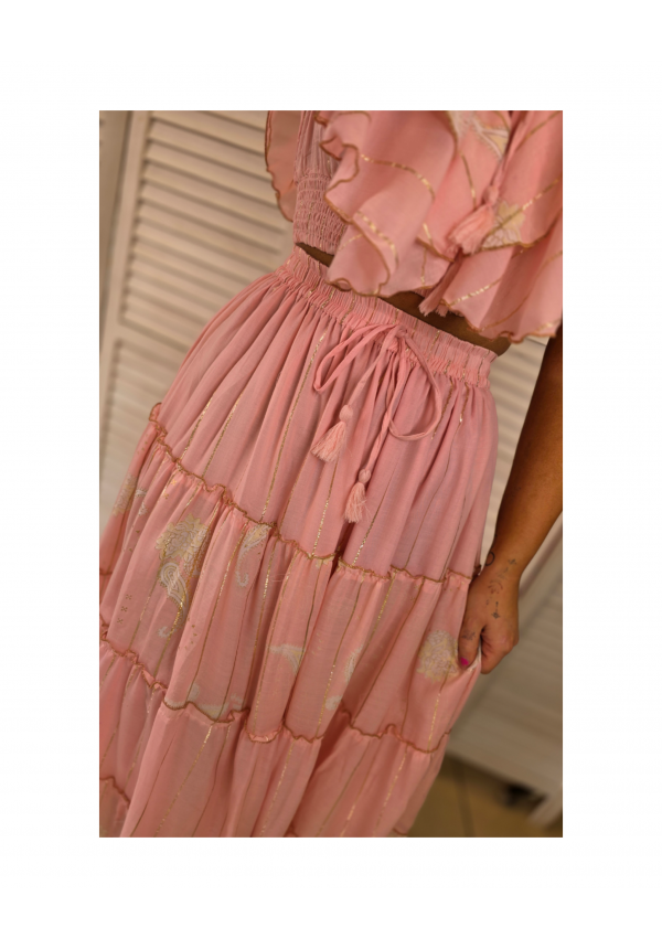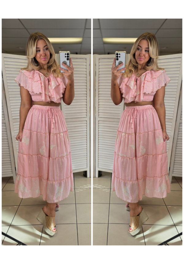 Designed to turn heads with effortless elegance, this dreamy two-piece features a soft, floaty silhouette in delicate hues, woven with subtle gold shimmer for that sun-kissed glow. The ruffle-detail top adds a touch of romance with its flattering neckline and relaxed fit, while the high-waisted, tiered maxi skirt flows beautifully with every step.