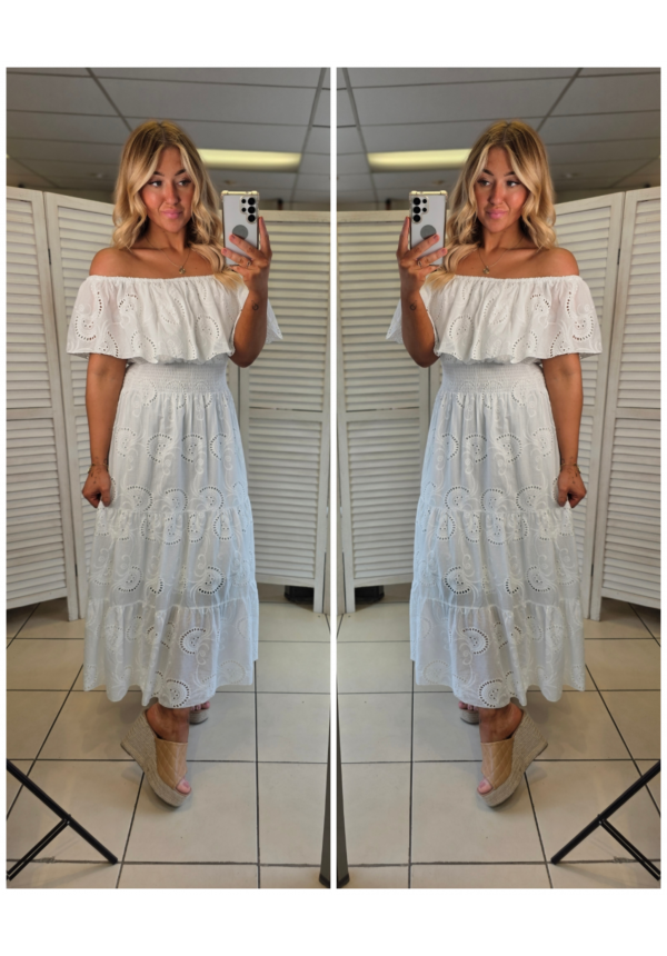 Effortlessly feminine and made to flatter — this off-the-shoulder midi dress is a must-have for easy, everyday styling. Designed with a softly elasticated bardot neckline, it sits beautifully across the shoulders while the shirred waistband cinches you in for a comfortable, flattering fit. The floaty skirt falls into a relaxed tiered shape, giving you that perfect movement with every step. Crafted from a lightweight, breathable fabric with delicate broderie detailing, it’s ideal for warmer days, holidays, or dressing up with wedges for an effortless summer look ☀️✨