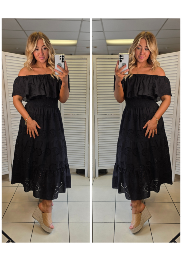 Effortlessly feminine and made to flatter — this off-the-shoulder midi dress is a must-have for easy, everyday styling. Designed with a softly elasticated bardot neckline, it sits beautifully across the shoulders while the shirred waistband cinches you in for a comfortable, flattering fit. The floaty skirt falls into a relaxed tiered shape, giving you that perfect movement with every step. Crafted from a lightweight, breathable fabric with delicate broderie detailing, it’s ideal for warmer days, holidays, or dressing up with wedges for an effortless summer look ☀️✨