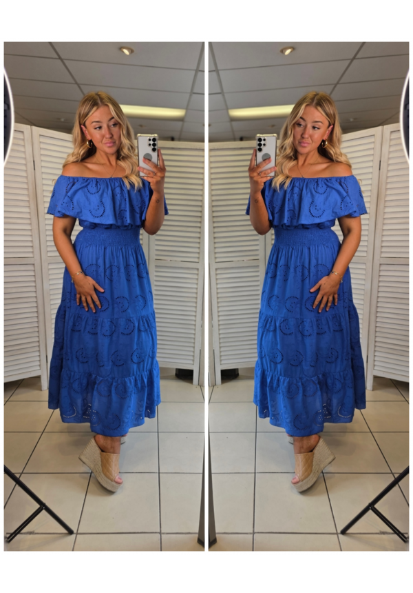 Effortlessly feminine and made to flatter — this off-the-shoulder midi dress is a must-have for easy, everyday styling. Designed with a softly elasticated bardot neckline, it sits beautifully across the shoulders while the shirred waistband cinches you in for a comfortable, flattering fit. The floaty skirt falls into a relaxed tiered shape, giving you that perfect movement with every step. Crafted from a lightweight, breathable fabric with delicate broderie detailing, it’s ideal for warmer days, holidays, or dressing up with wedges for an effortless summer look ☀️✨
