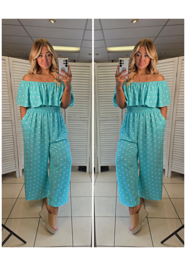 CURVY GIRLS BARDOT JUMPSUIT - POLKA DOT - TURQUOISE