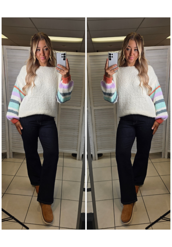 Soft, cosy and full of charm, the Sleeve Me Dreaming knit is all about the details. Crafted in a fluffy cream knit with a relaxed fit, this jumper features gently ballooned long sleeves finished with pastel-striped accents for a subtle pop of colour. Effortlessly comfy yet beautifully styled, it’s the perfect throw-on piece for laid-back days when you still want to feel put together.