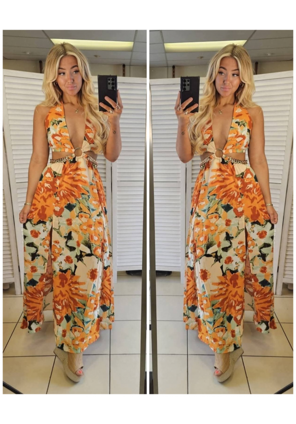 Turn heads from golden hour to after dark in the Sunset Siren Maxi Dress. Designed with a plunging halter neckline and statement ring detail, this stunning maxi creates the perfect flattering silhouette. The vibrant tropical-inspired print brings all the summer energy, while the flowing skirt and sultry side split add effortless movement with every step.